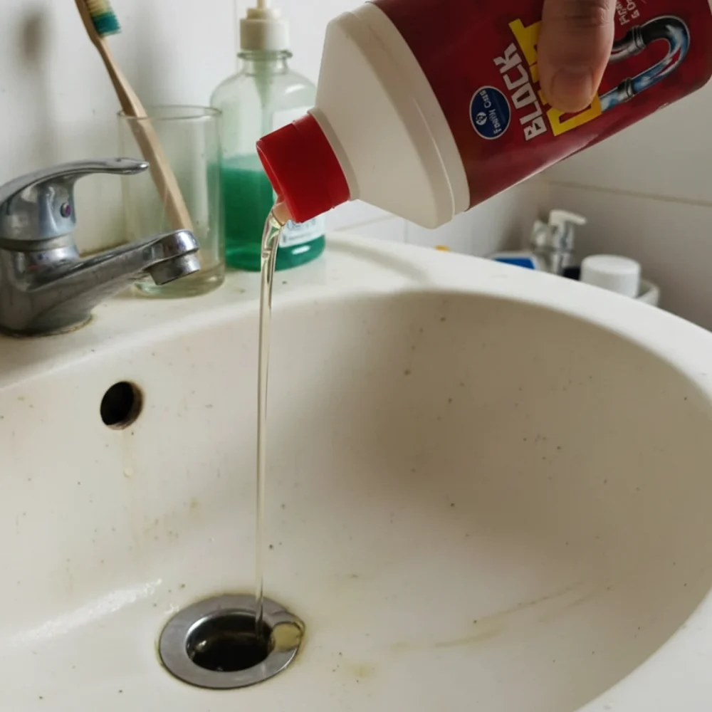 Image shown a person pouring block out drain cleaner inside a basin to cleaning the water pipeline